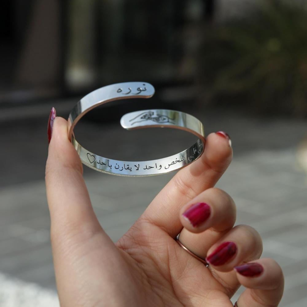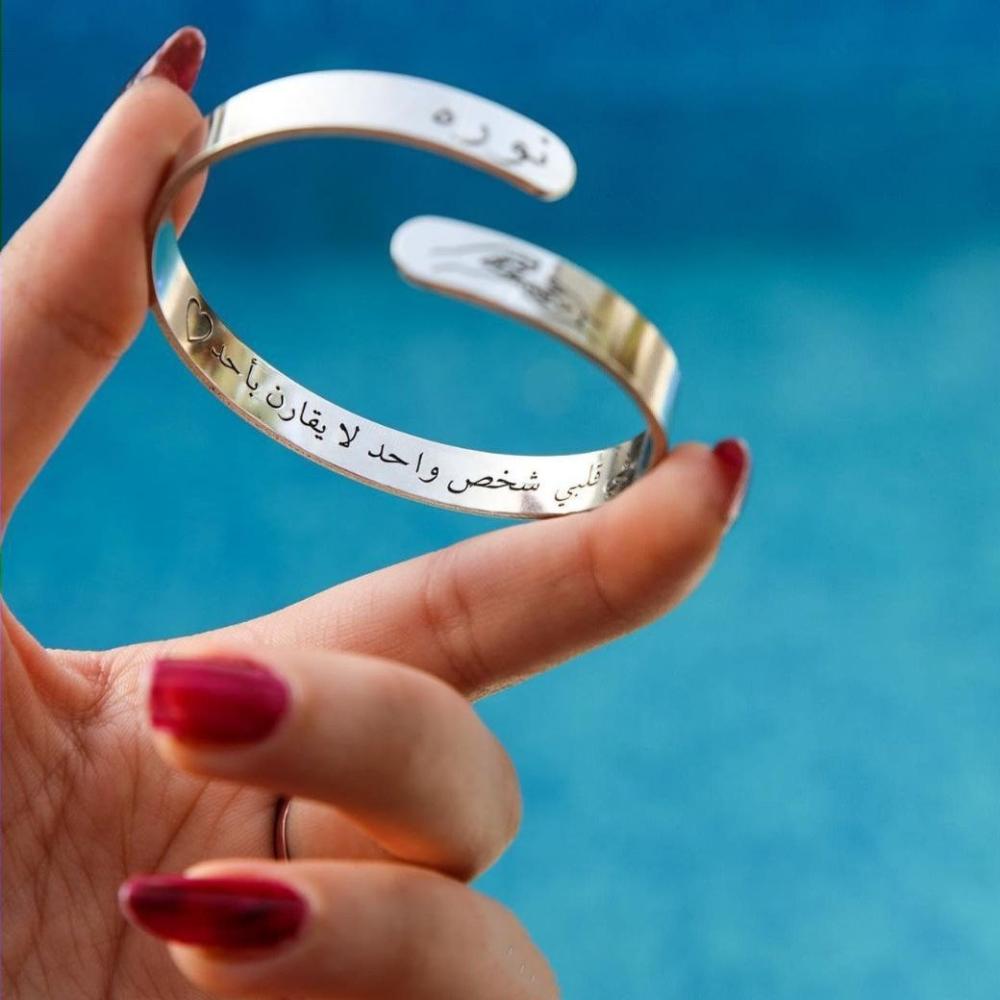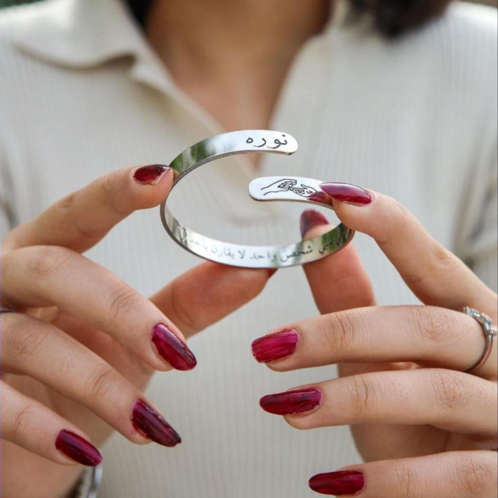 اسواره بالاسم بتصميم مميز بالإضافة إلى رسمة ليدين متشابكتين، مما يجعله قطعة مميزة وعاطفية - متجر ريفـان