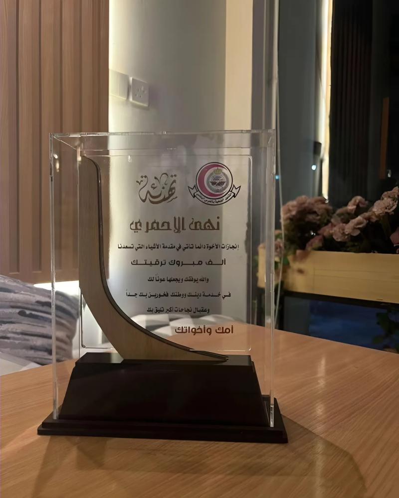 يأتي الدرع مزينًا بألواح الأكريليك الشفافة، مع حفر اسم المكرَّم وشعاره حسب الطلب، ليكون ذكرى خالدة تعبّر عن التقدير والنجاح.