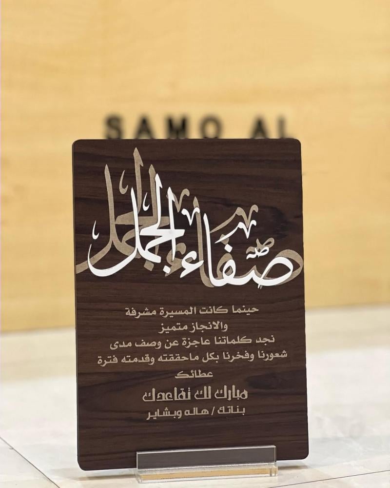تصميم خشبي فاخر بحفر دقيق لأسماء المتقاعد(ة) وكلمات التقدير